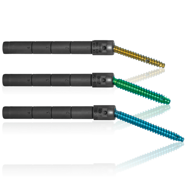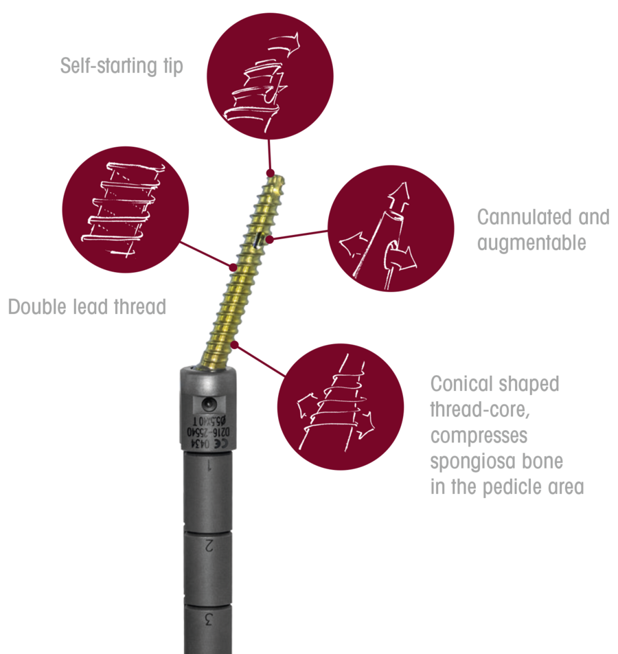- Conical shaped threadcore, compresses the spongiosa bone inside the pedicle area