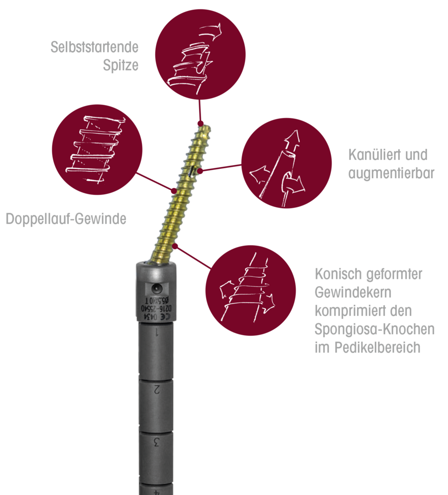 - Konisch geformter Gewindekern komprimiert den Spongiosa-Knochen im Pedikelbereich