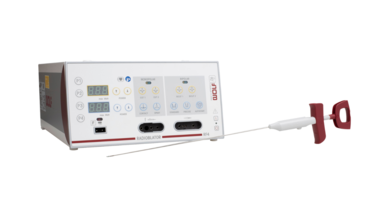 Der Hochfrequenzgenerator Radioblator RF4 mit einer Betriebsfrequenz von 4 MHz bildet das Kernstück dieses wirksamen, gewebeschonenden Koagulationssystems. In Verbindung mit der aktiv abwinkelbaren TipControl-HF-Elektrode ist eine präzise, kontrollierte Positionierung der Hochfrequenzanwendung im Gewebe sichergestellt.